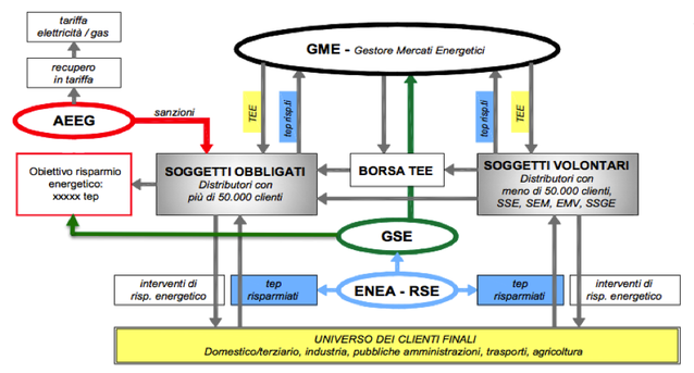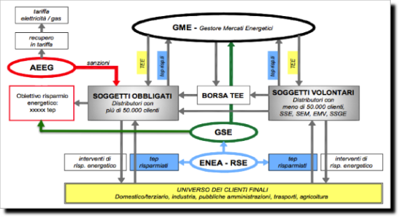 I soggetti obbligati sono i grandi distributori di energia, mentre i soggetti volontari sono piccoli distributori di energia con meno di 50.000 clienti, società di servizi energetici (SSE), soggetti con energy manager (ovvero aziende pubbliche e private rispettivamente con consumi superiori ad i 1000 e 10000 TEP/annui), soggetti con energy manager volontario, soggetti che hanno implementato un sistema di gestione dell’energia conforme alla ISO 50001 (SSGE).